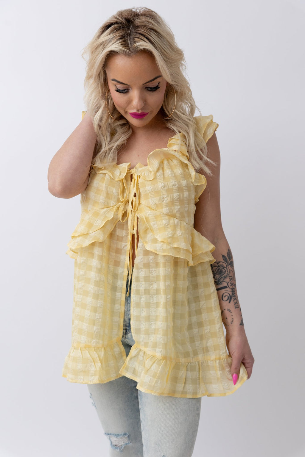 Chiffon Sear Sucker Gingham Tunic Top | Yellow