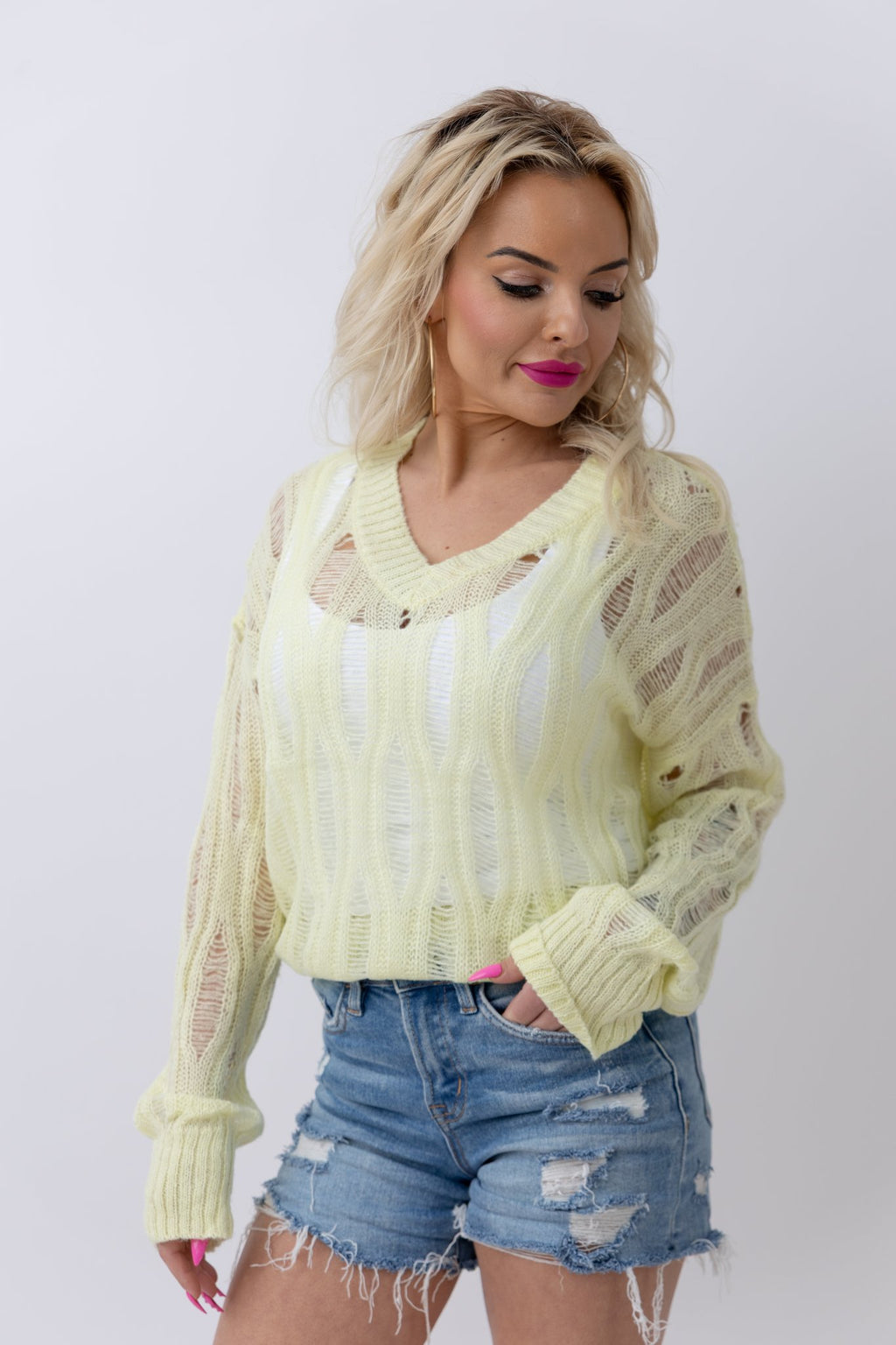 Distressed V-Neck Sweater | Lime