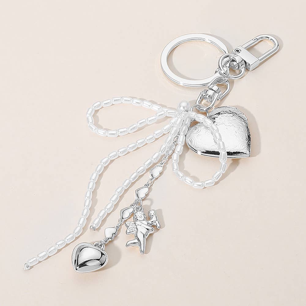 Pearl Beaded Bow Metal Heart Embellished Bag Charm Keychain: Silver