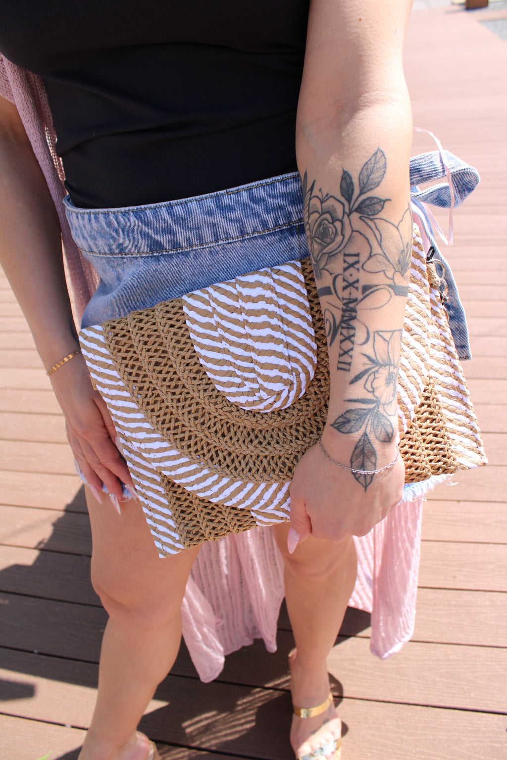 Mixed Striped Straw Clutch / Crossbody Bag : Taupe