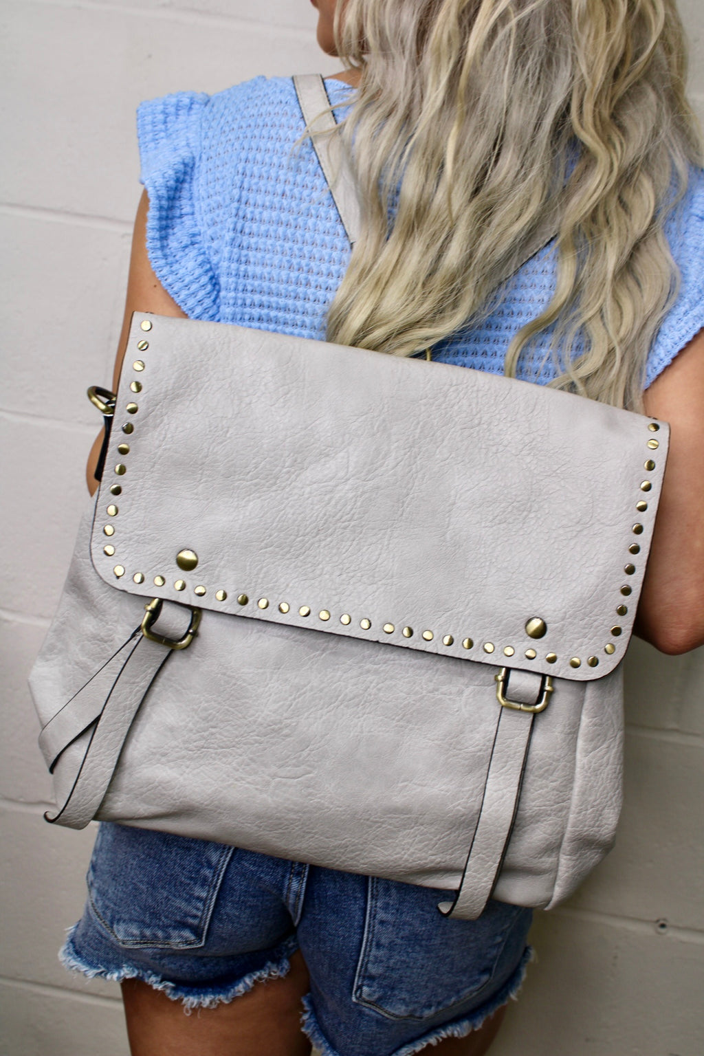 Indigo Backpack w/ Studded Details: Light Grey