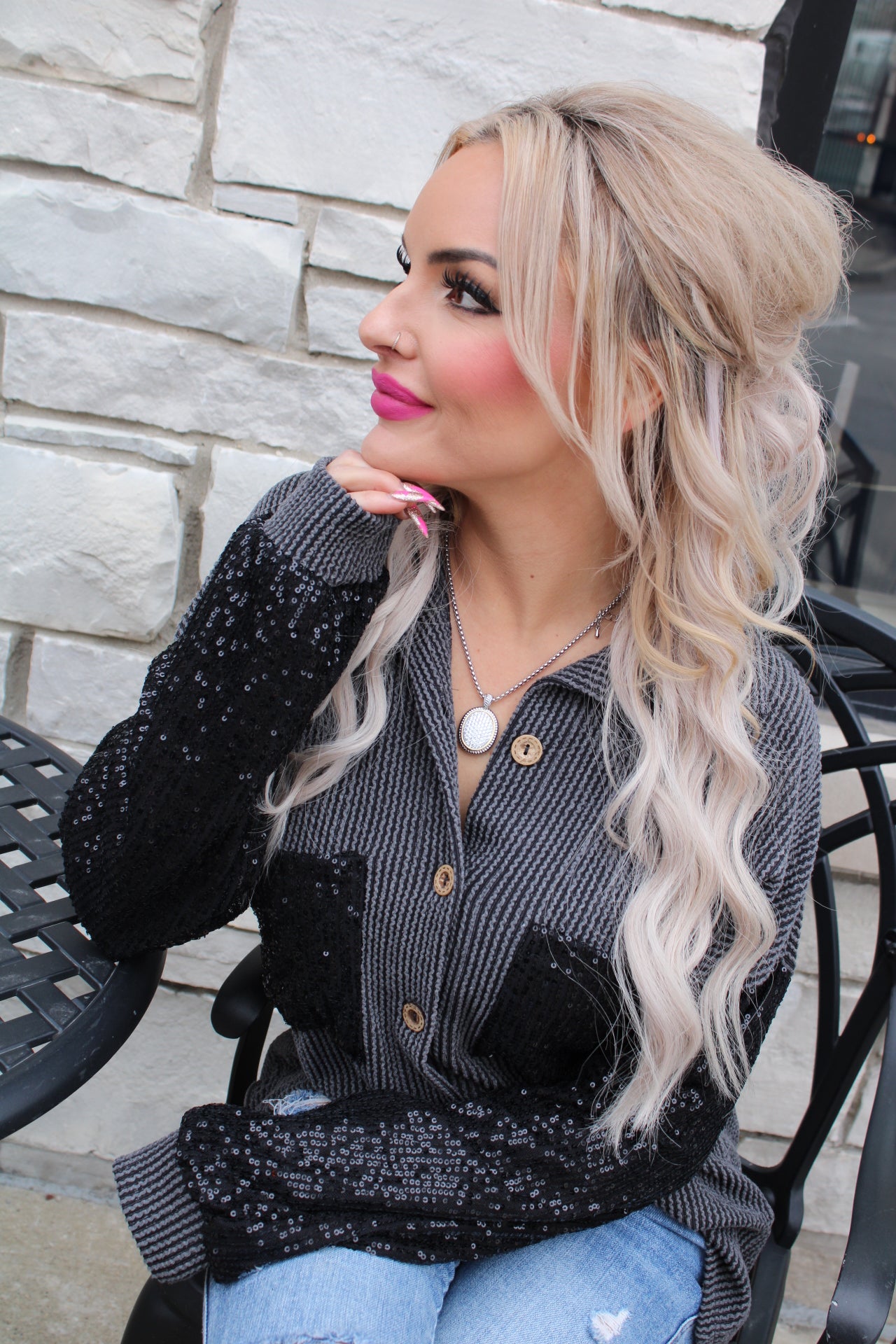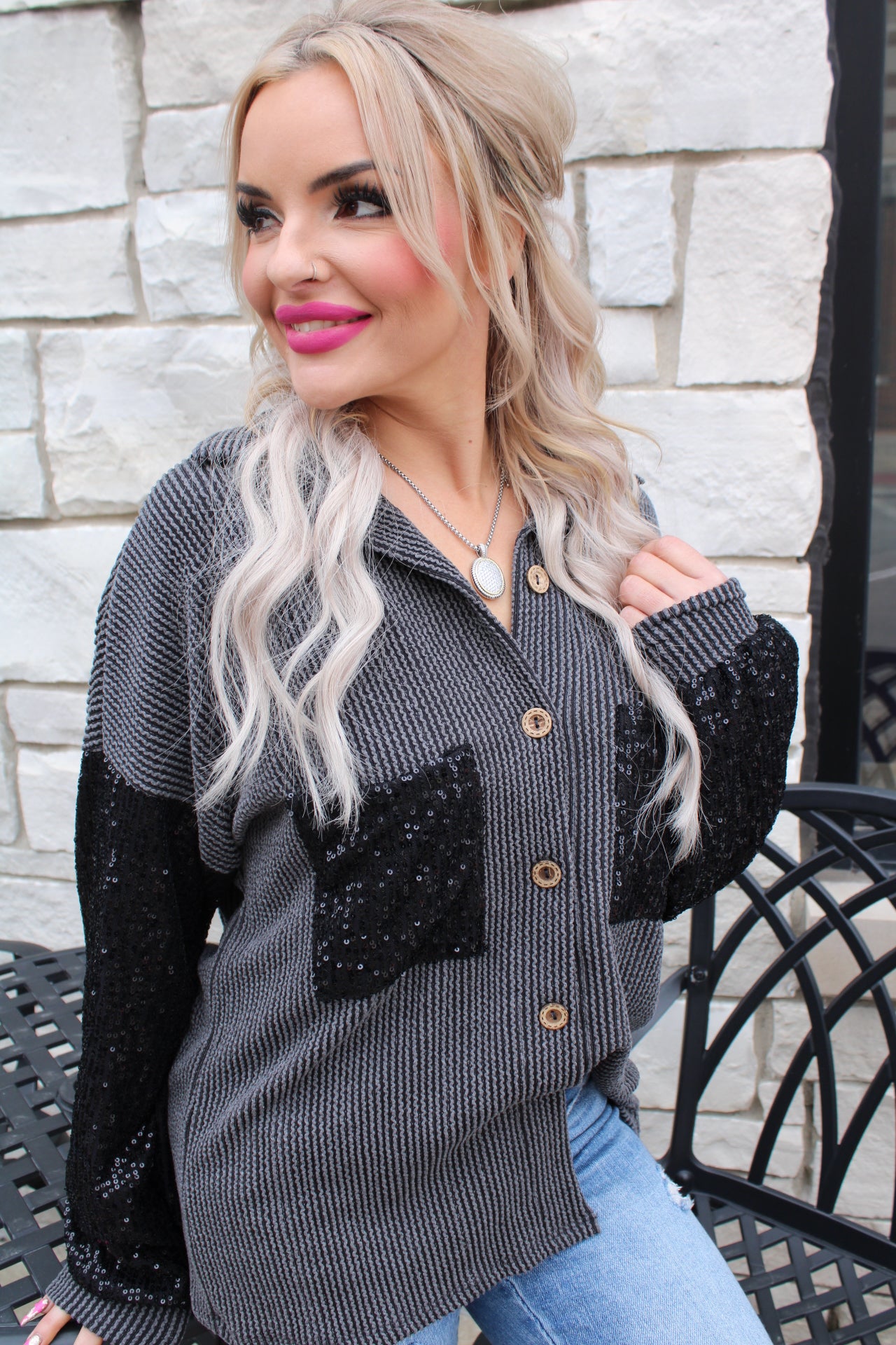 Turn a classic on its head with our Gray Ribbed Shacket with Contrasting Black Sequin Sleeves — cozy, casual, and just a little bit extra.
