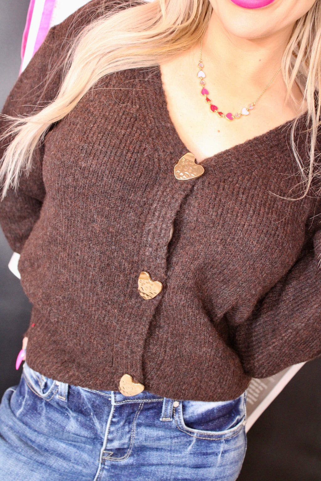 V-Neck Heart Chunky Knit Metal Button Cardigan | Brown