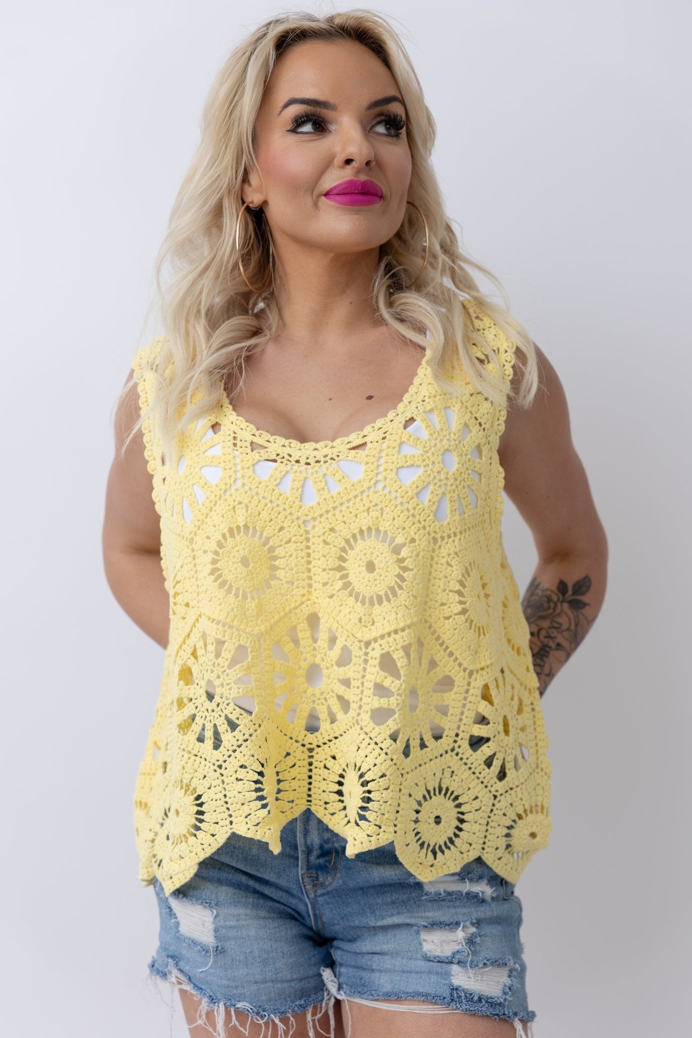 Layer it over a bralette for a laid-back vibe or pair it with denim shorts, white jeans, or a flowy skirt for the ultimate spring-to-summer look. Whether you’re heading to brunch, the farmers market, or a weekend getaway, this yellow crochet tank brings all the fresh, feel-good energy.