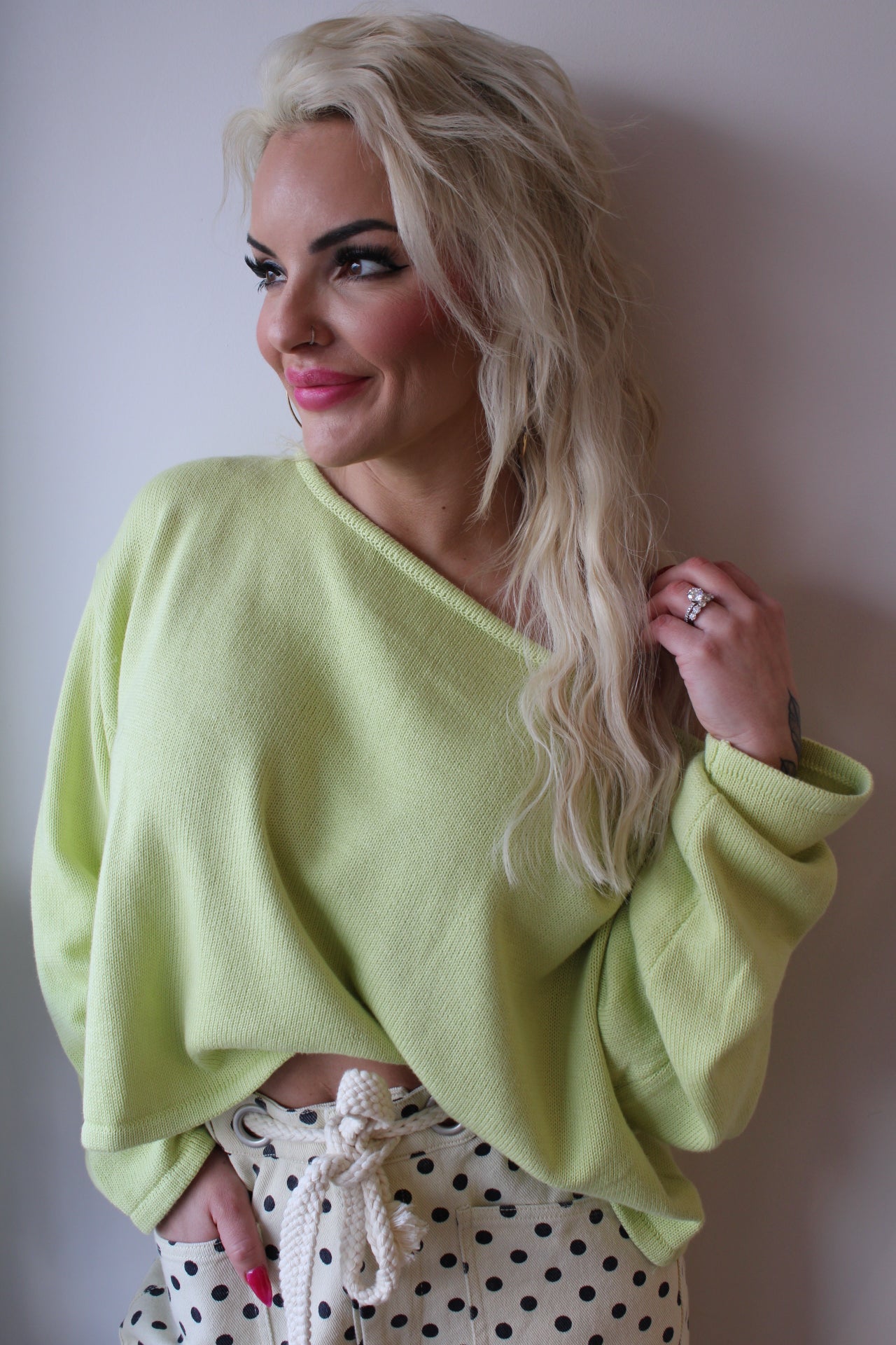 This lightweight knit is made for effortless, laid-back style with a touch of flirty charm. The relaxed neckline can be worn off one shoulder or draped normally, giving you versatile styling options depending on your vibe. The oversized fit feels cozy but breathable — perfect for those cool spring mornings and breezy evenings — and the fresh lime shade adds a fun, feel-good pop to your wardrobe.