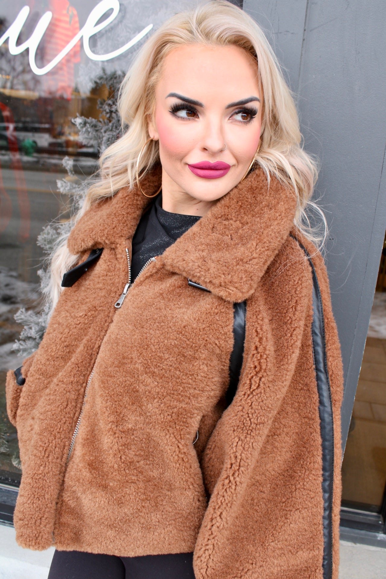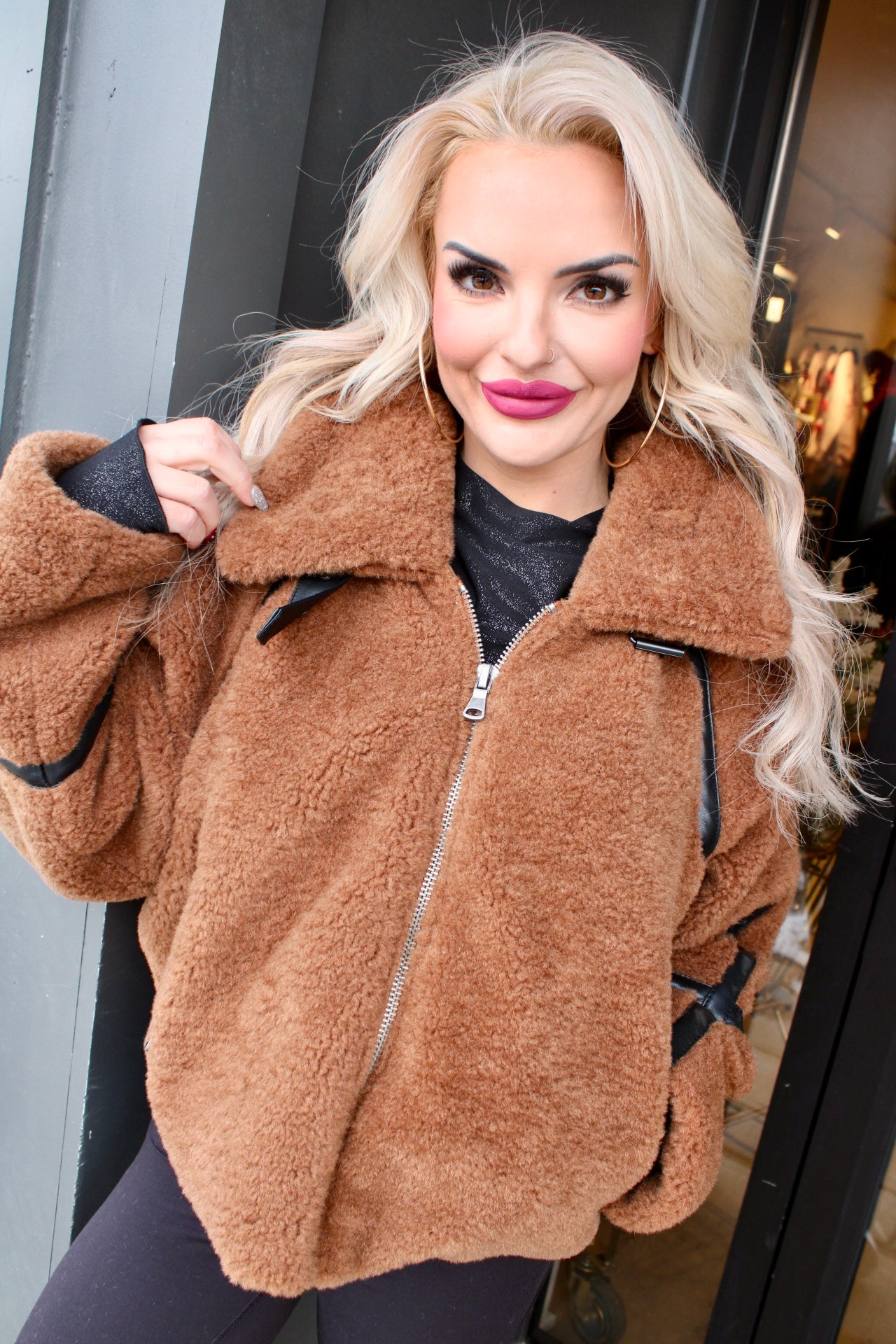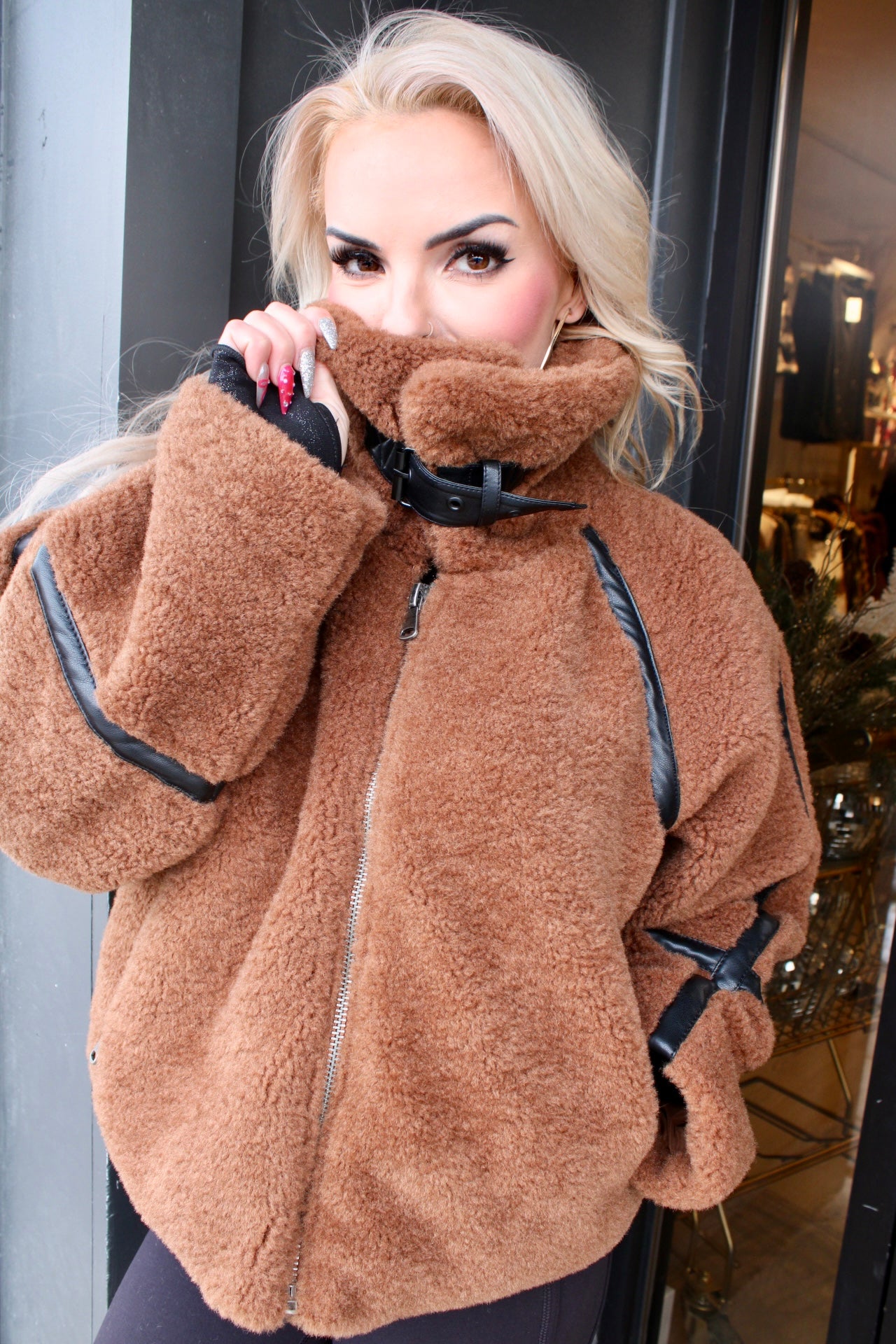 Meet your new cold-weather power piece — our Faux Shearling Aviator Jacket in a rich camel tone with chic brown pleather contrast details.
