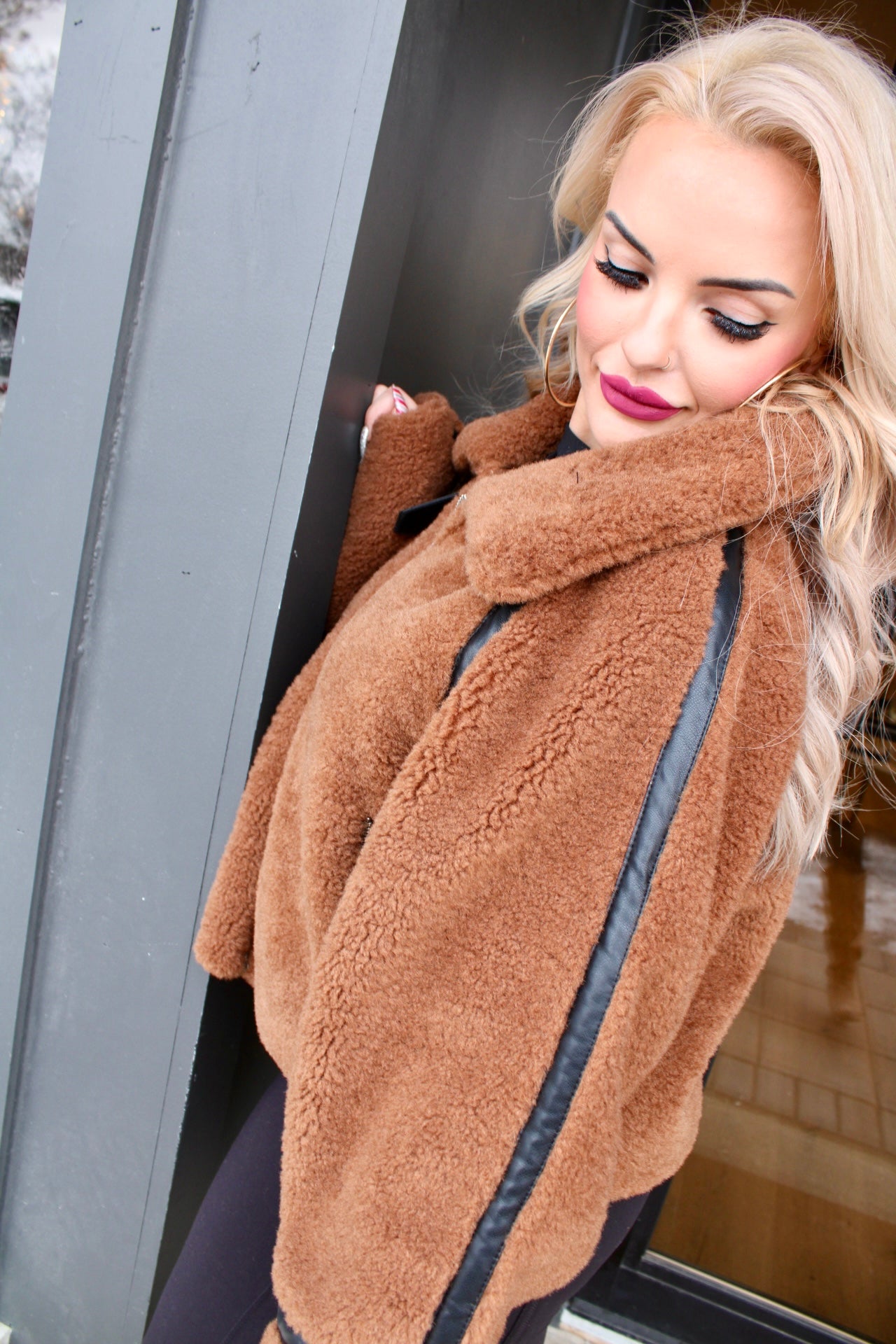 This jacket is everything: warm, soft, stylish, and totally mom-life friendly. The plush faux shearling exterior gives you that cozy, snuggled-up feel, while the structured aviator silhouette keeps it sleek and sophisticated. The brown pleather trim adds a gorgeous contrast that makes the whole look feel high-end and designer-inspired — without the designer price tag.