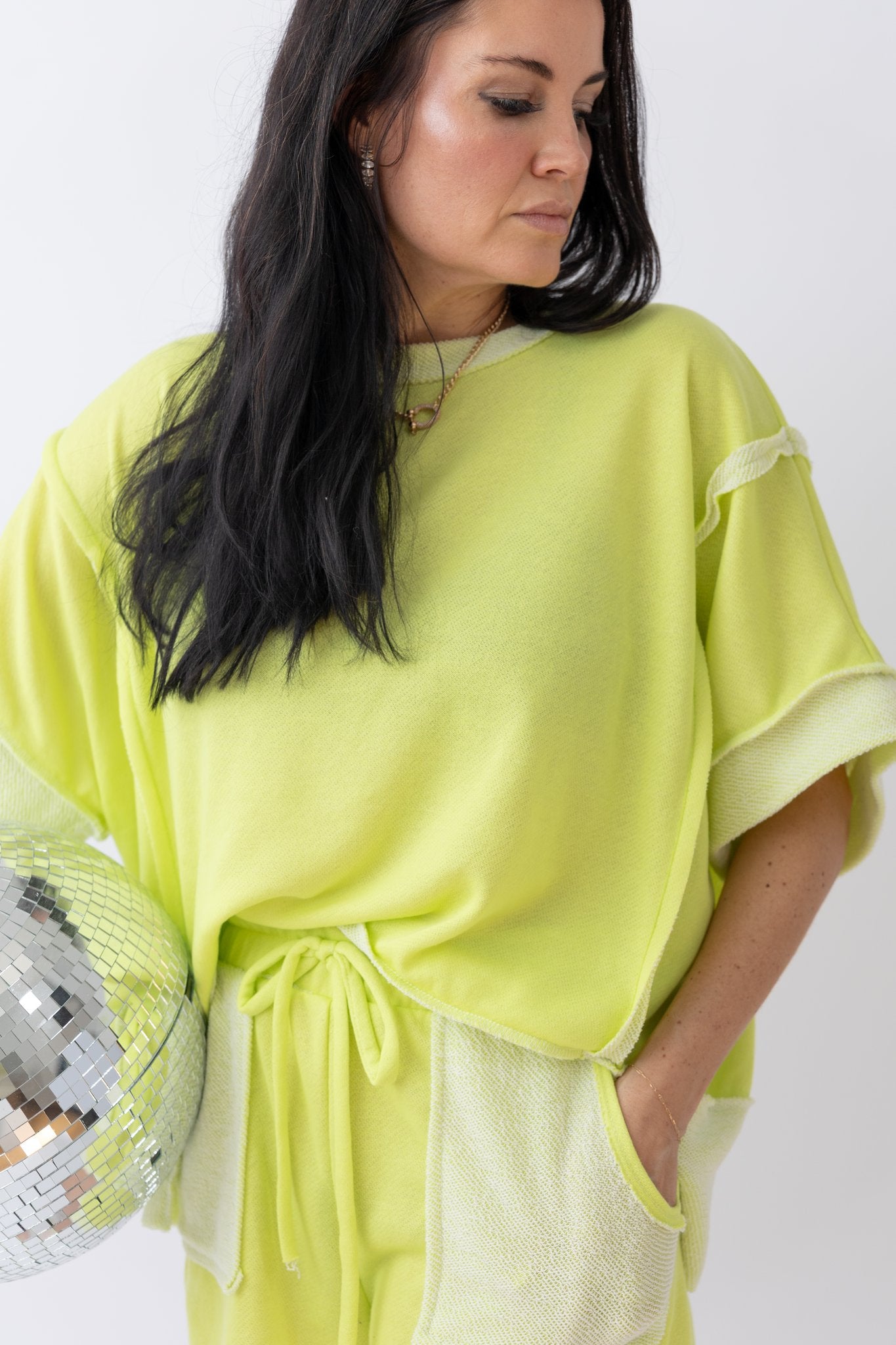 This oversized reverse contrast banded top in vibrant lime green is the statement piece your casual wardrobe’s been craving. Designed with a relaxed, oversized fit, it delivers that perfectly slouchy, on-trend vibe while keeping you comfortable all day long. The reverse contrast detailing and banded accents add a unique, inside-out inspired edge that sets it apart from your everyday basics.
