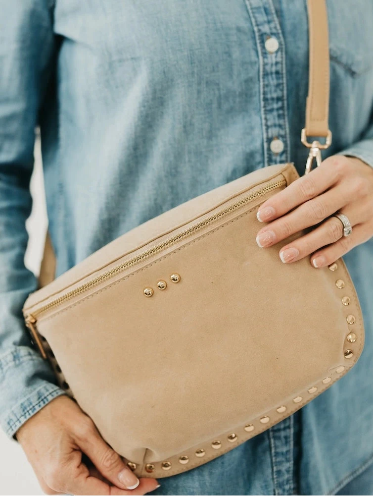 Meet the Sabrina Studded Vegan Suede Bum Bag your new go-to accessory! This playful pack combines buttery soft vegan/faux suede with eye-catching gold rivet details for a look that's equal parts chic and edgy. Choose from four stunning colors to match your vibe, and stay organized with smart interior pockets. Perfect for hands-free adventures, whether you're hitting the town or running errands. Elevate your everyday carry game! Measurements: 12"x9"x2" Material: Vegan/Faux Suede