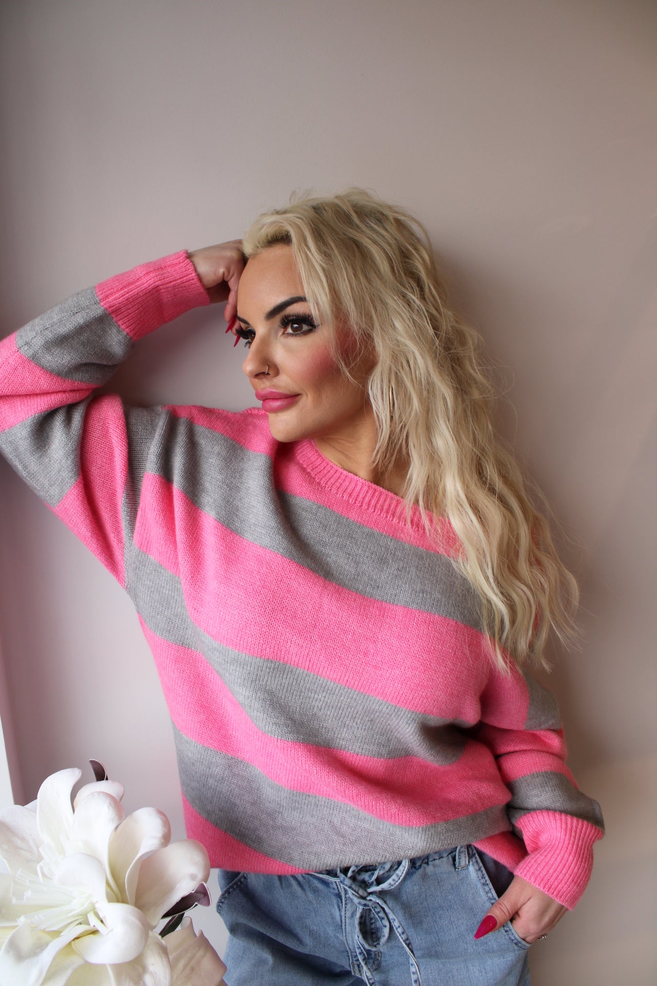 Meet your perfect spring knit — our Boat Neck Long Sleeve Stripe Sweater in soft pink and gray.