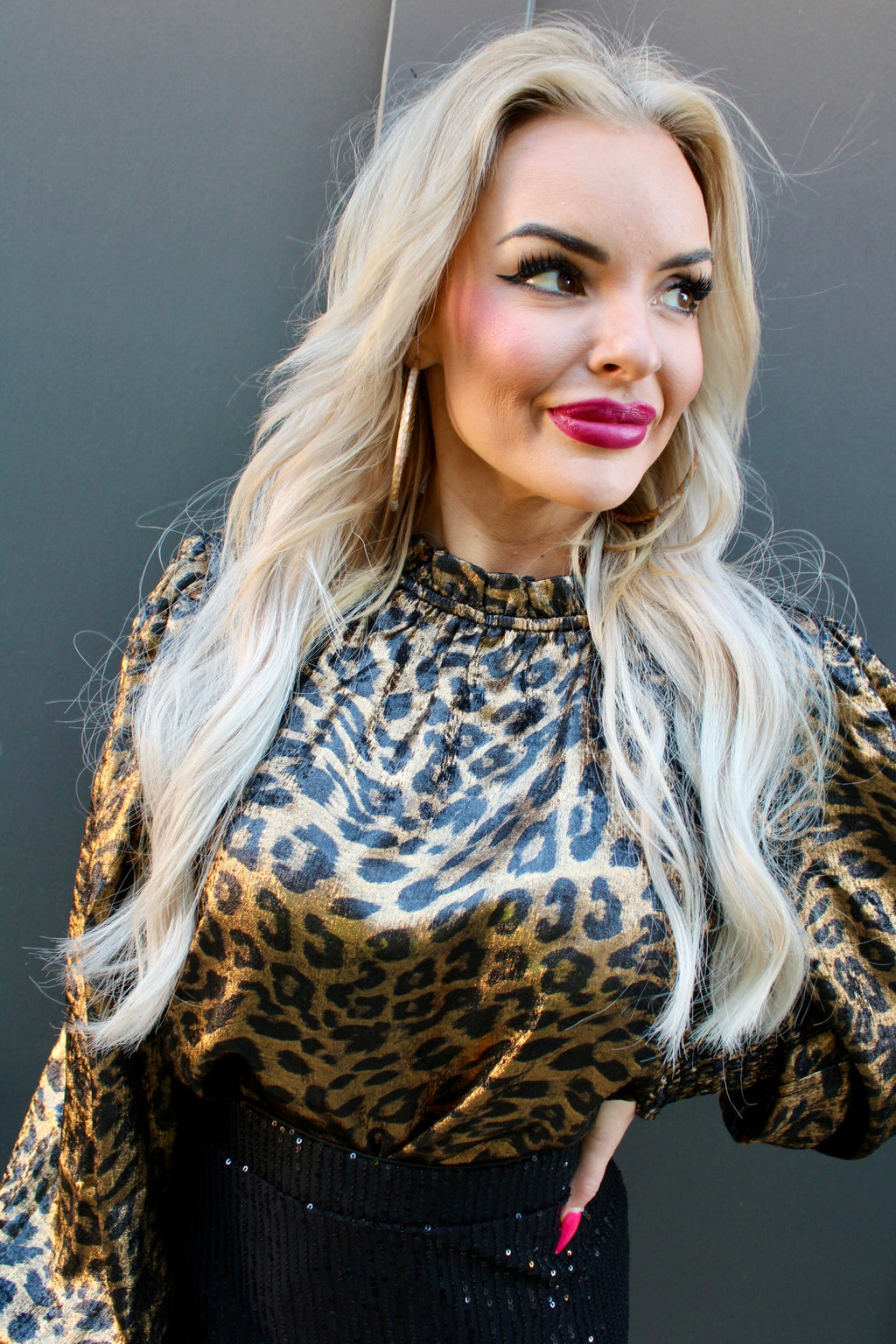 Mock Neck Long Sleeve Slim Fit Sheer Top Gold Mesh