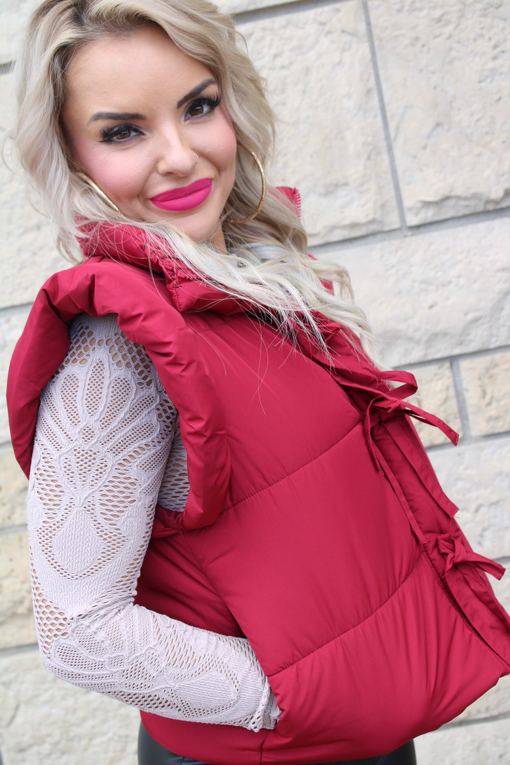 Flutter Sleeve Bow Detail Puffer Vest | Cranberry