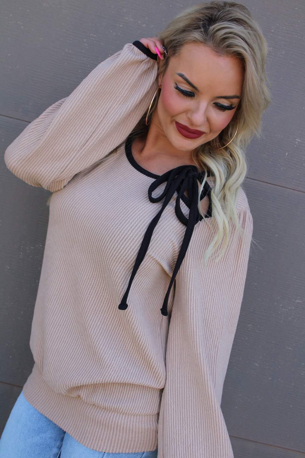 Round Neck Bow Tie Detail Long Sleeve Top | Taupe