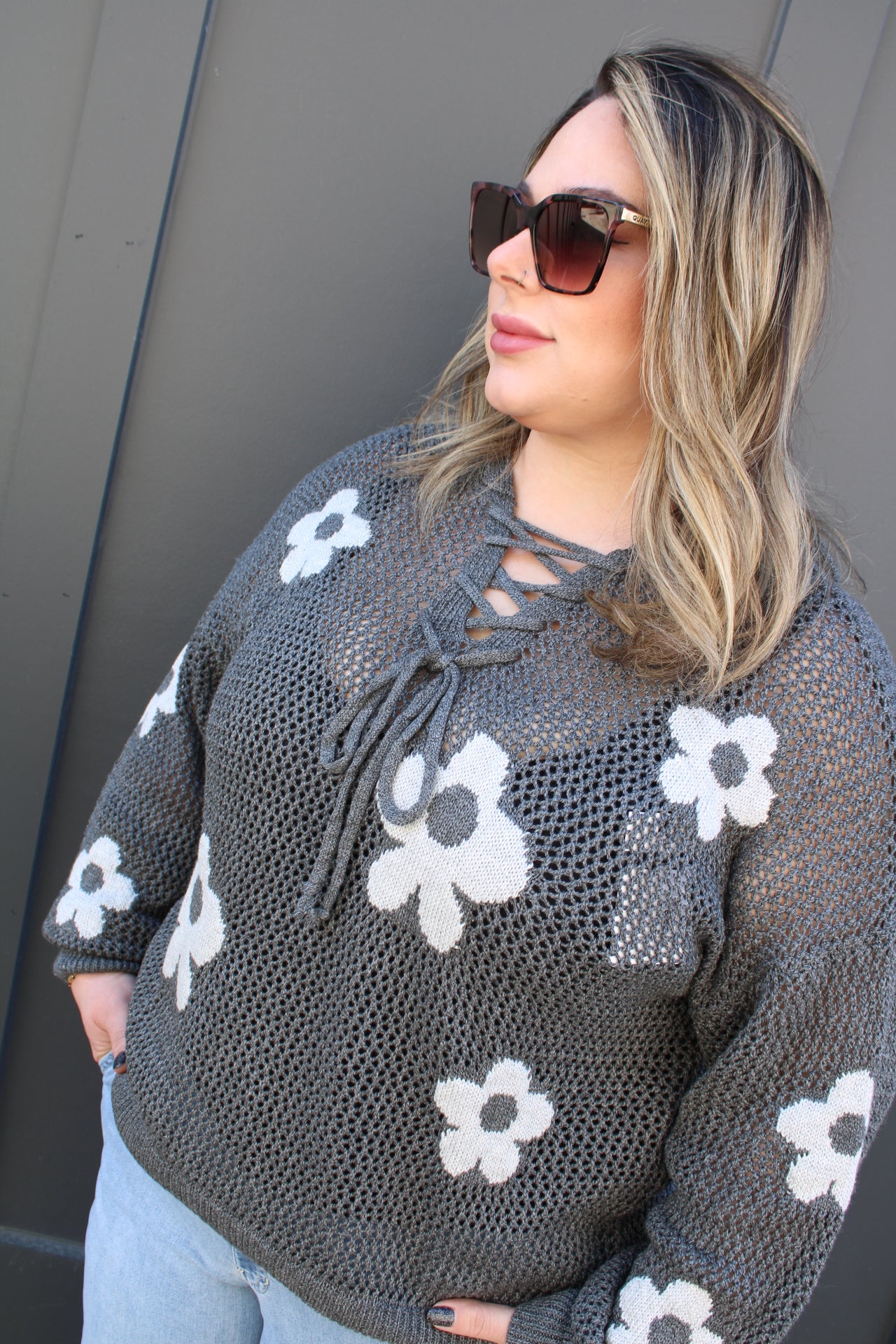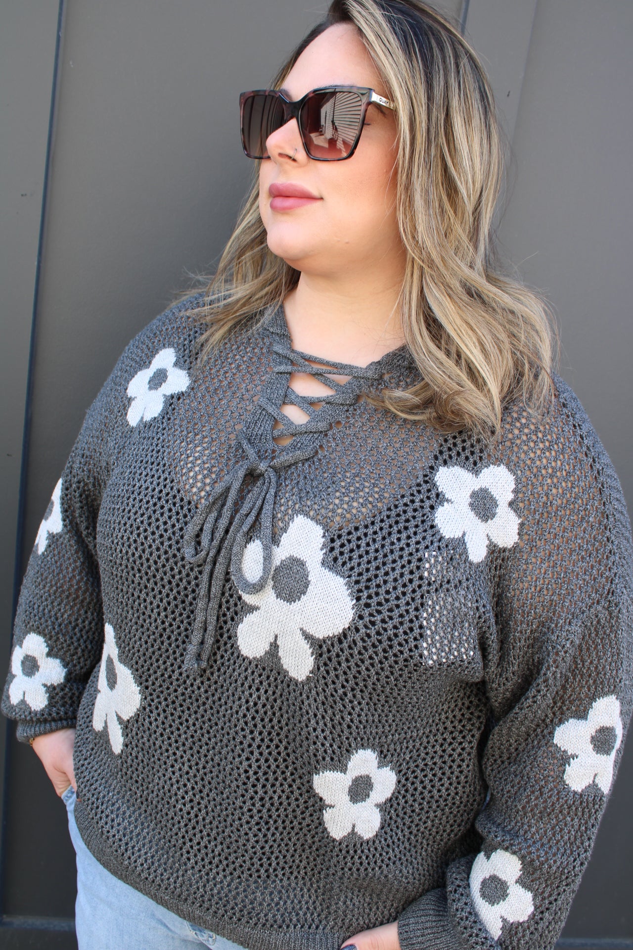 This lightweight crochet knit features beautiful floral detailing that gives it that effortless boho vibe we all love. The airy design makes it perfect for spring days, keeping you comfortable without feeling heavy, while the relaxed fit gives it that easy, throw-on-and-go feel. The charcoal color adds a modern edge and makes it super versatile for everyday wear.