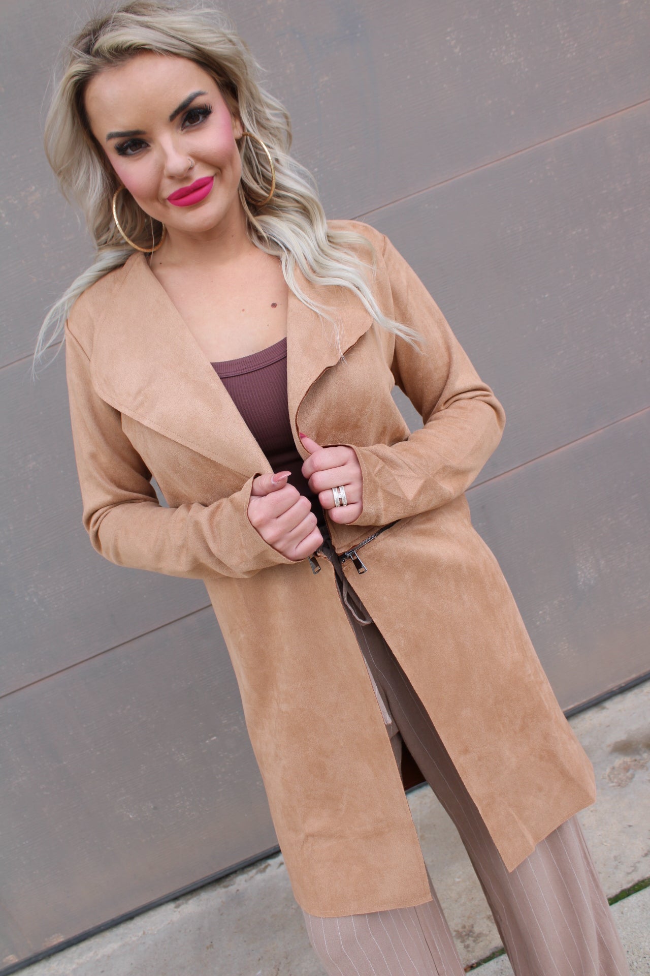 Restocked: Long Sleeve Front Two Zipper Detail Faux Suede Long Jacket