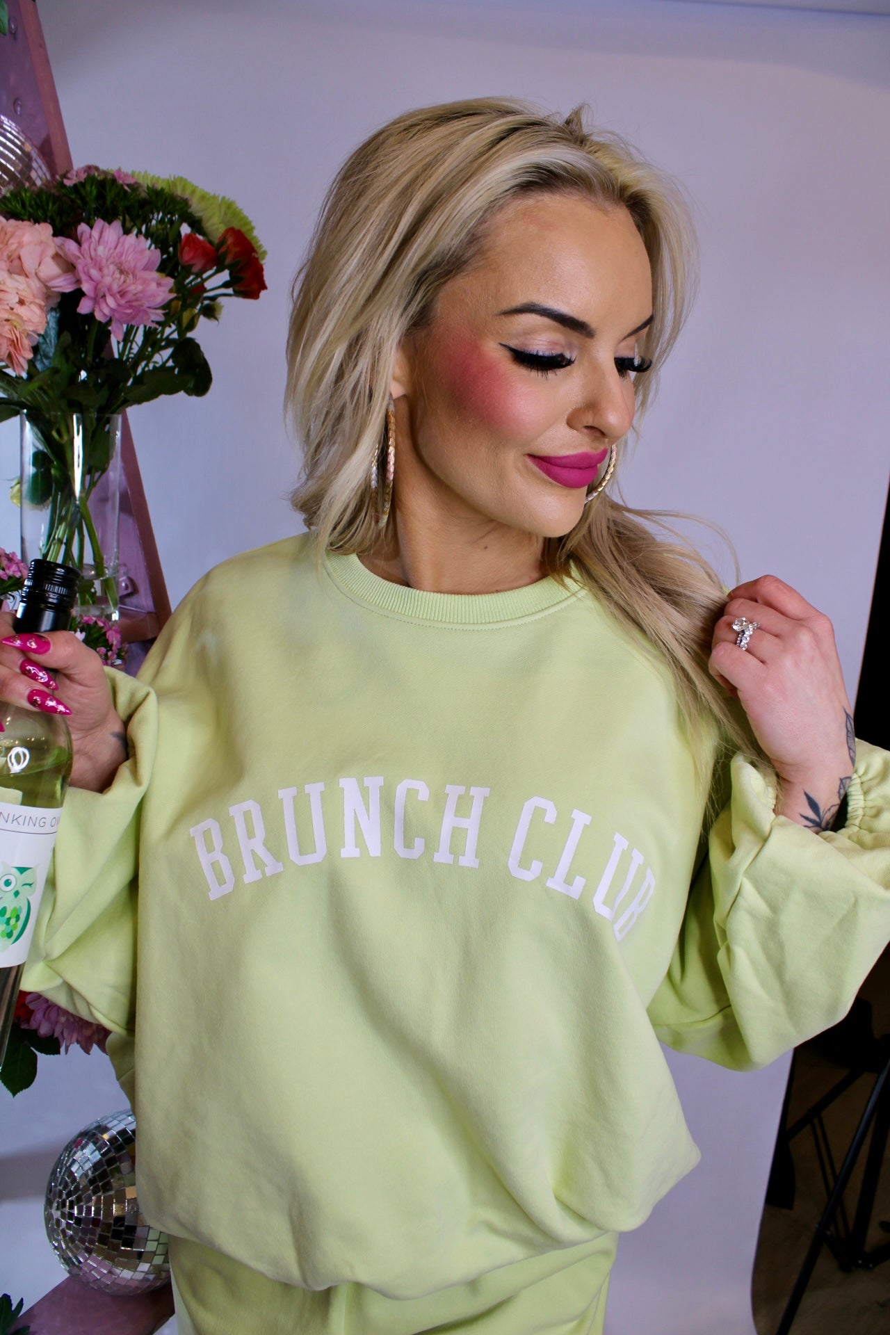 The sweatshirt features a relaxed crew neckline with a trendy bubble hem for that perfectly slouchy-but-styled look, finished with the fun Brunch Club graphic we’re all obsessed with. The matching barrel sweatpants have that cool, modern silhouette with an easy fit that’s made for all-day wear — from couch to coffee run to brunch dates with the girls.