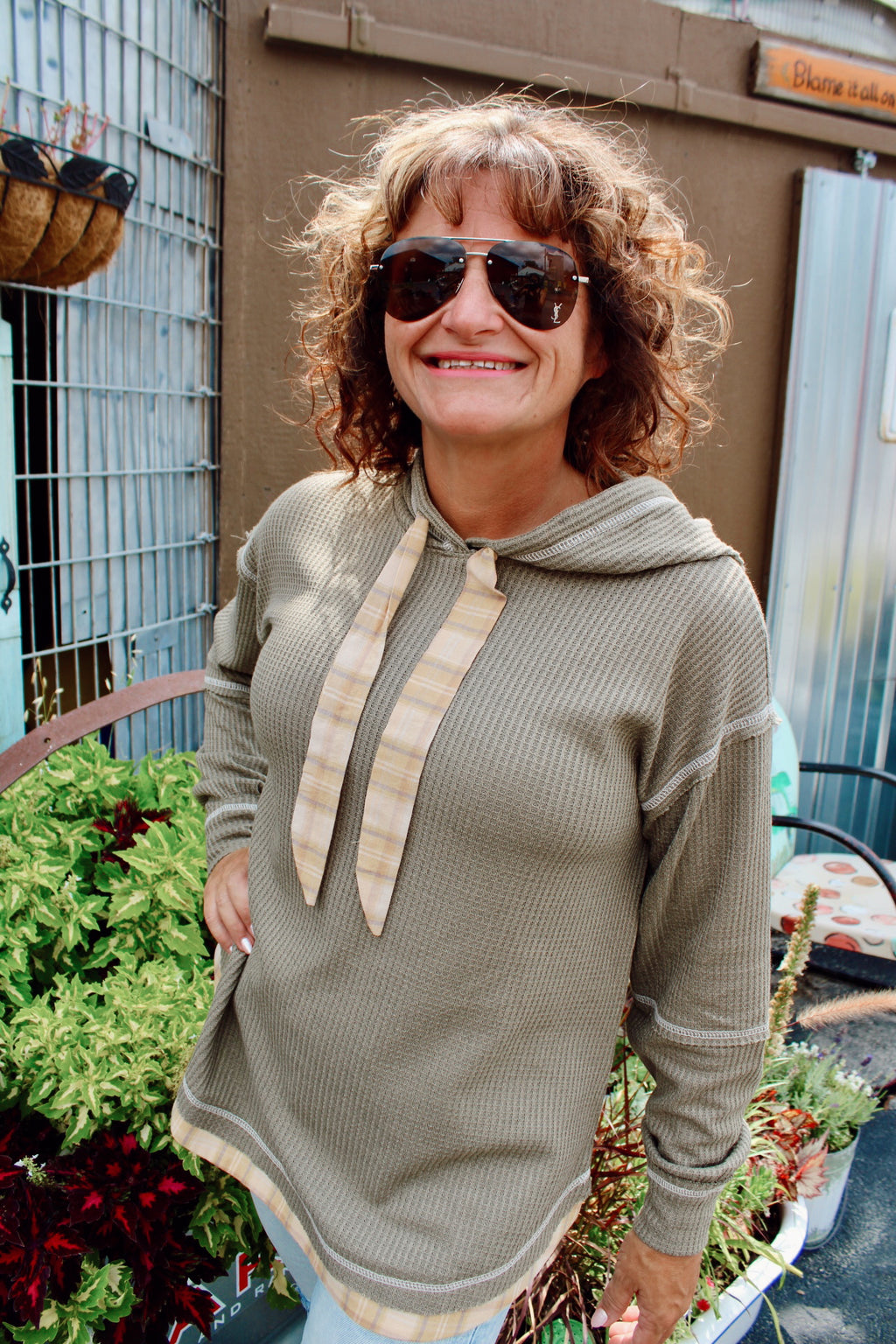 Fall is Back Waffle Knit Plaid Detailed Top | Olive