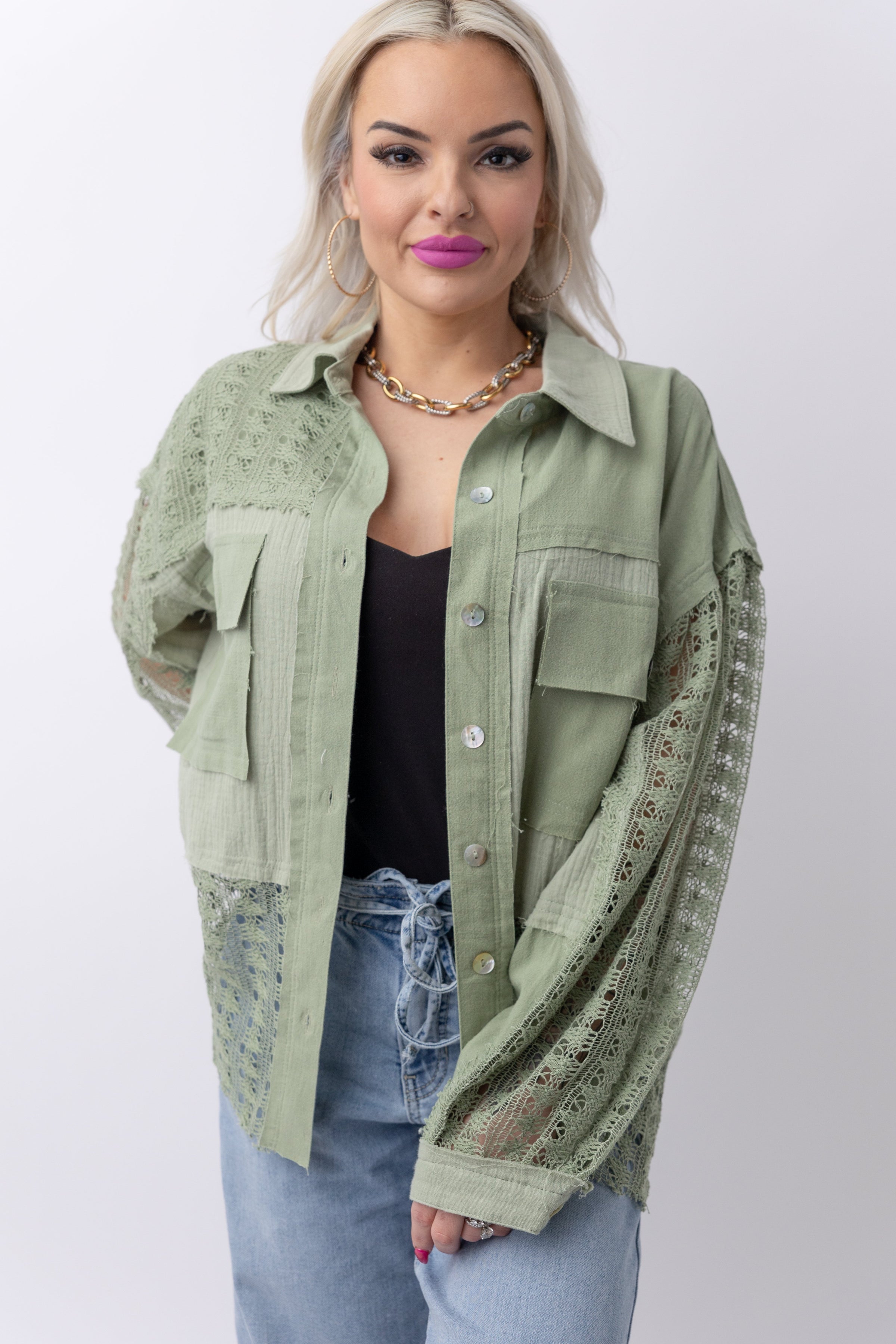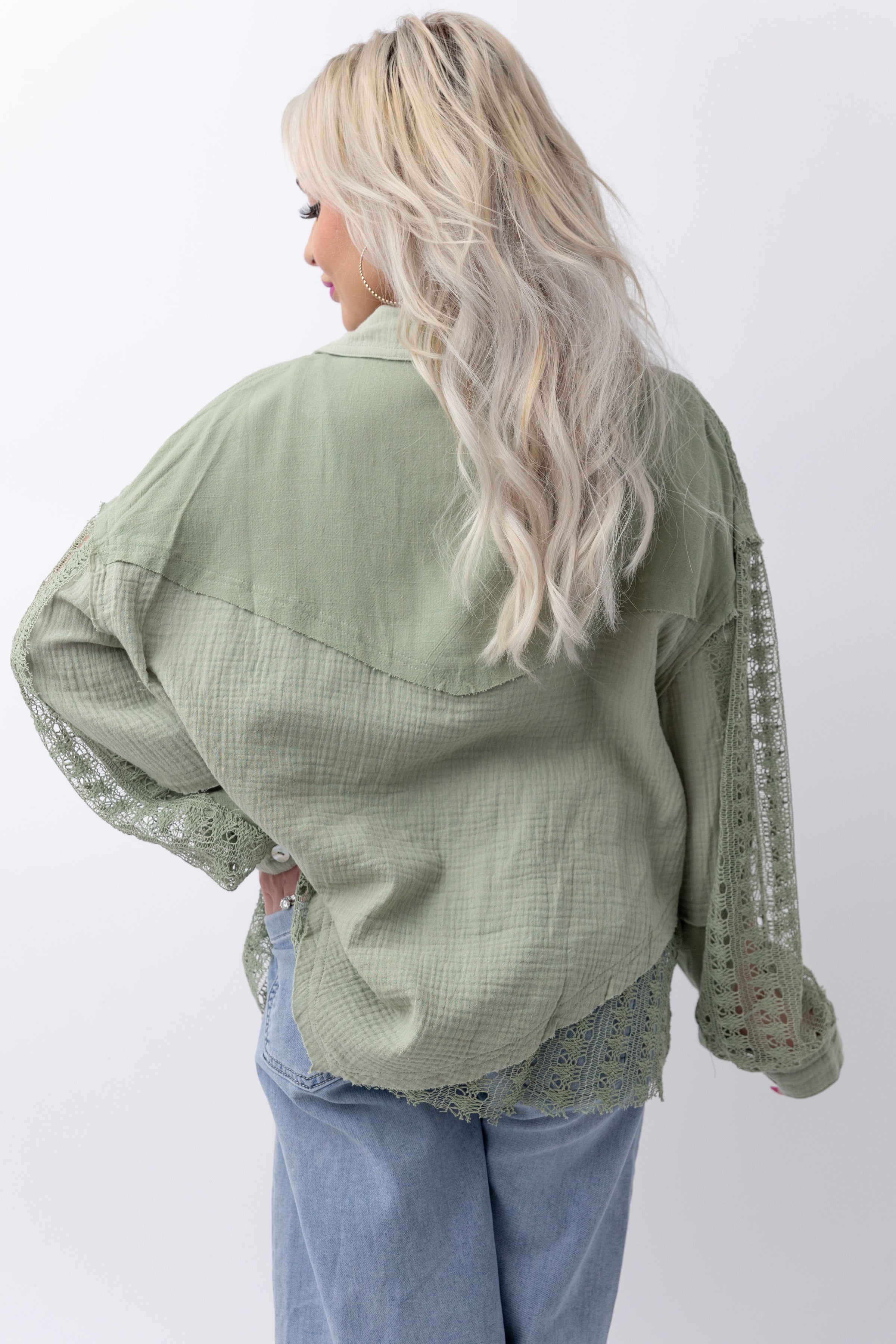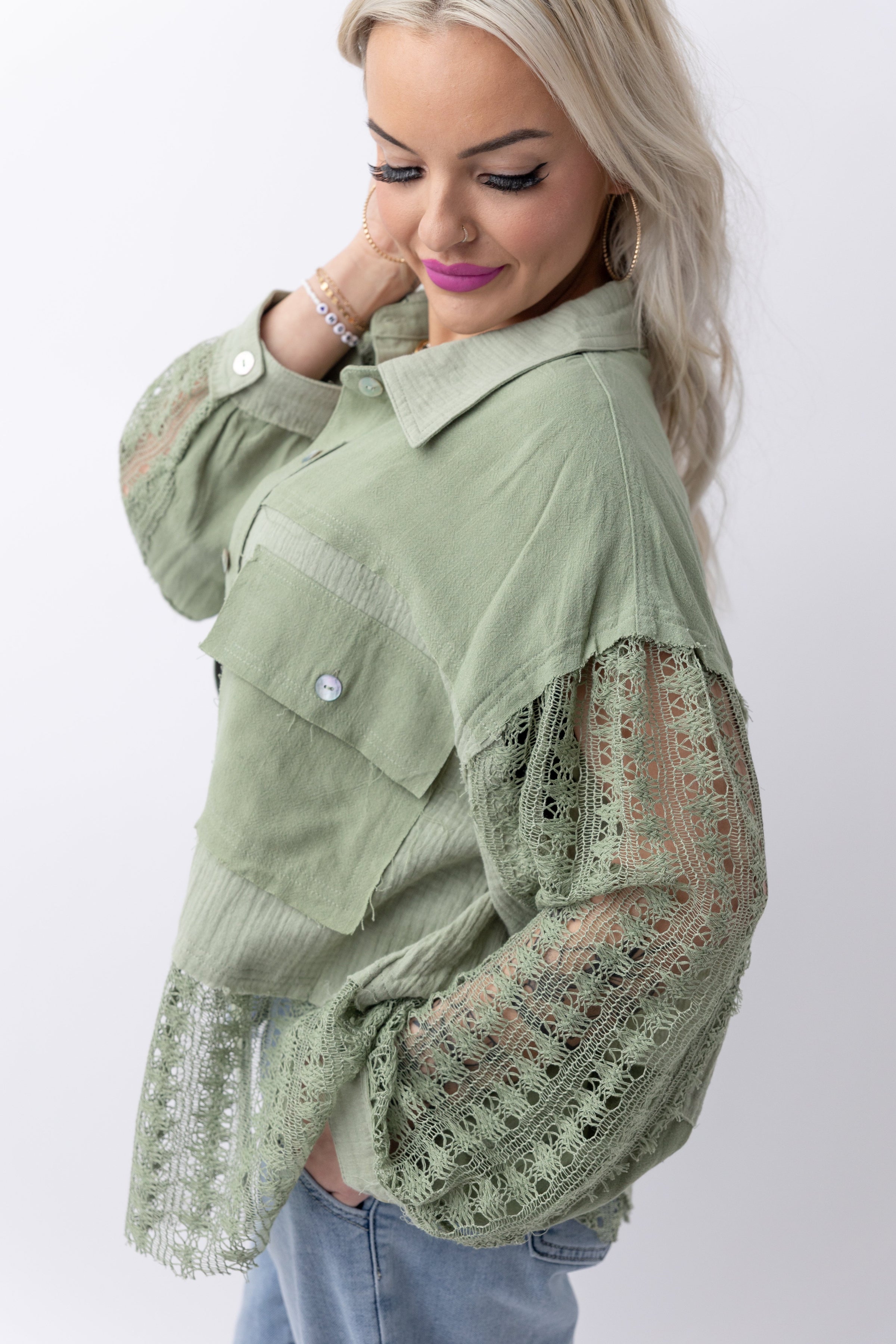 This beautiful blouse features delicate lace sleeves and lace panel detailing that adds texture and romance to a classic button-up silhouette. The soft sage hue feels fresh and flattering, while the relaxed fit keeps it comfortable enough for all-day wear.